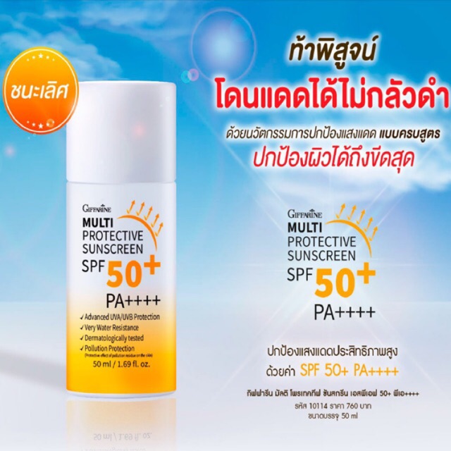 🔥🌞ครีมกันแดดที่ดีที่สุดจากกิฟฟารีน Giffarine Multi Protective Sunscreen SPF50+ PA++++ 🌞ด้วยนวัตกรรมสารปกป้องแสงแดดแบบครบสูตร ที่มี Bis-Ethylhexyloxyphenol Methoxyphenyl Triazine และ Diethylamino Hydroxybenzoyl Hexyl Benzoate ทำให้ป้องกันแสงแดดได้อย่างมั่นใจ •🌞ปกป้องผิวจากมลภาวะ ฝุ่นควัน • 🌞กันน้ำ ปกป้องผิวอย่างต่อเนื่องและยาวนาน • 🌞ไม่มีส่วนผสมของสารที่อาจก่อให้เกิดการแพ้หรือระคายเคือง •🌞 เนื้อน้ำนม บางเบา ซึมเร็ว สบายผิว เกลี่ยง่ายไม่เป็นคราบ • 🌞แนะนำโดยผู้เชี่ยวชาญด้านผิวหนังว่าไม่ก่อให้เกิดการระคายเคือง 🔥แดดแรง มลภาวะเยอะขนาดไหนก็ไม่กลัว! 🔥ท้าพิสูจน์ ไม่พอใจ ยินดีคืนเงินจ้า🔥